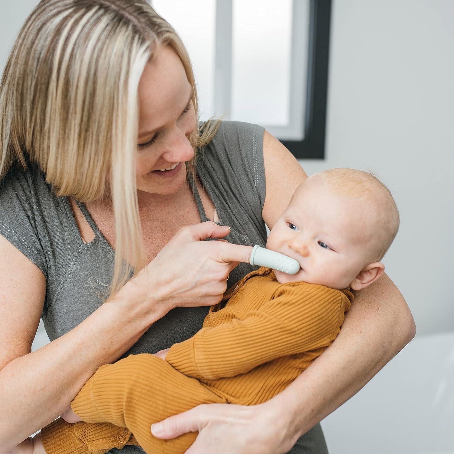 BABY’S FIRST TOOTHBRUSH. Teach baby healthy oral hygiene habits with the super-soft 100% silicone finger toothbrush that’s gentle on sensitive mouths.