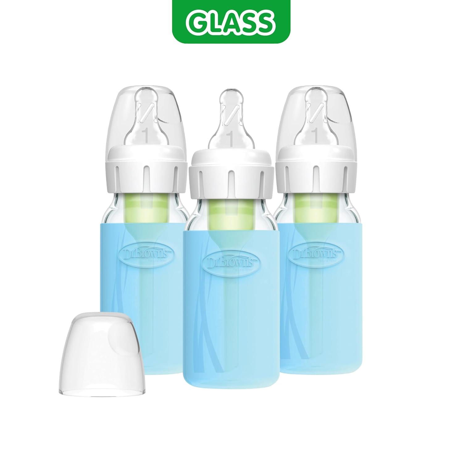 Dr. Brown's Anti-Colic Options+ Narrow Glass Baby Bottles 4 oz/120 mL, with Level 1 Slow Flow Nipple, 3 Pack 0m+ with Blue 100% Silicone Sleeves, BPA-Free(Blue 4 oz)