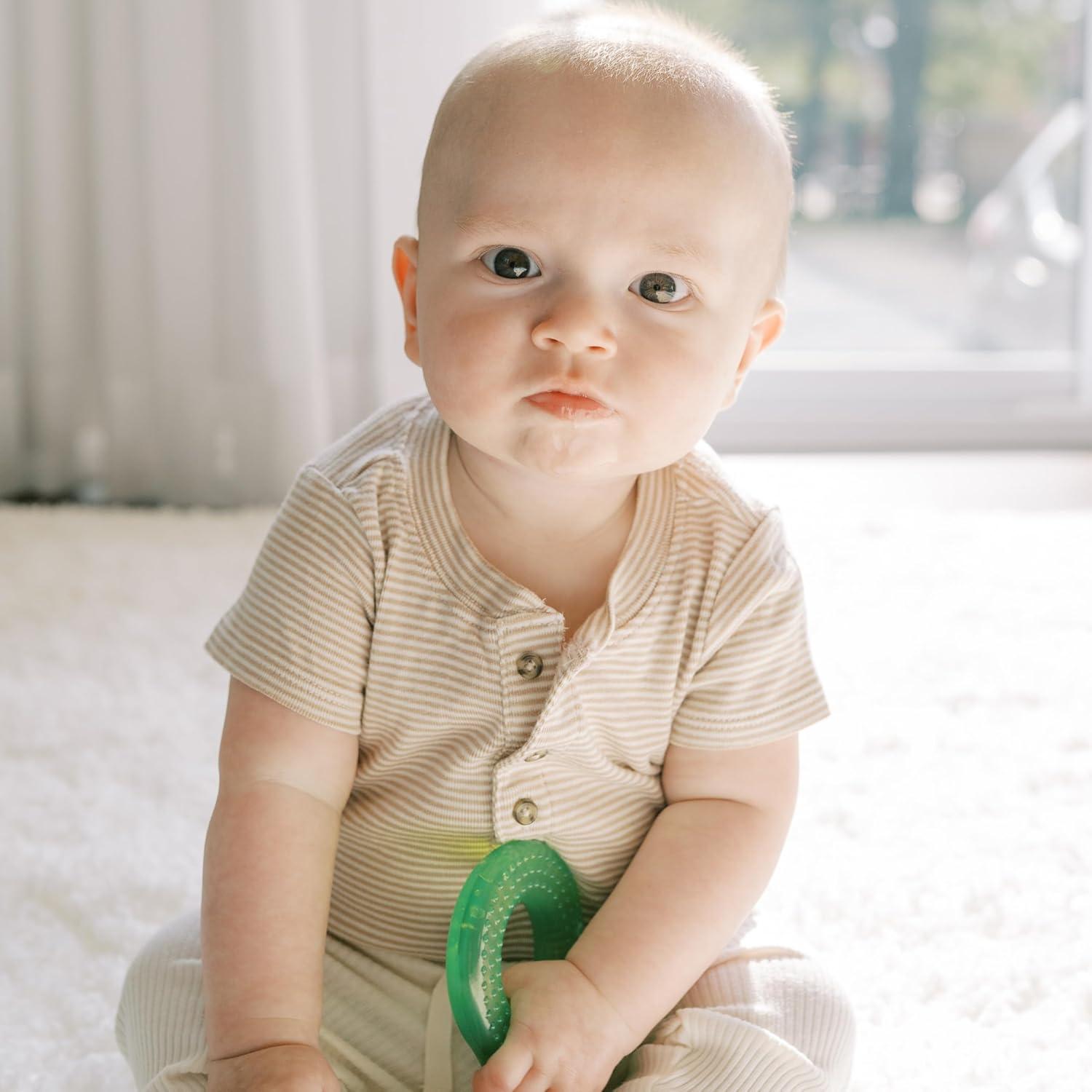 QUICKLY SOOTHE SORE GUMS. Designed to be placed in the refrigerator, the teething toy is filled with 100% purified water to cool and soothe all areas of the mouth giving baby relief from teething discomfort.