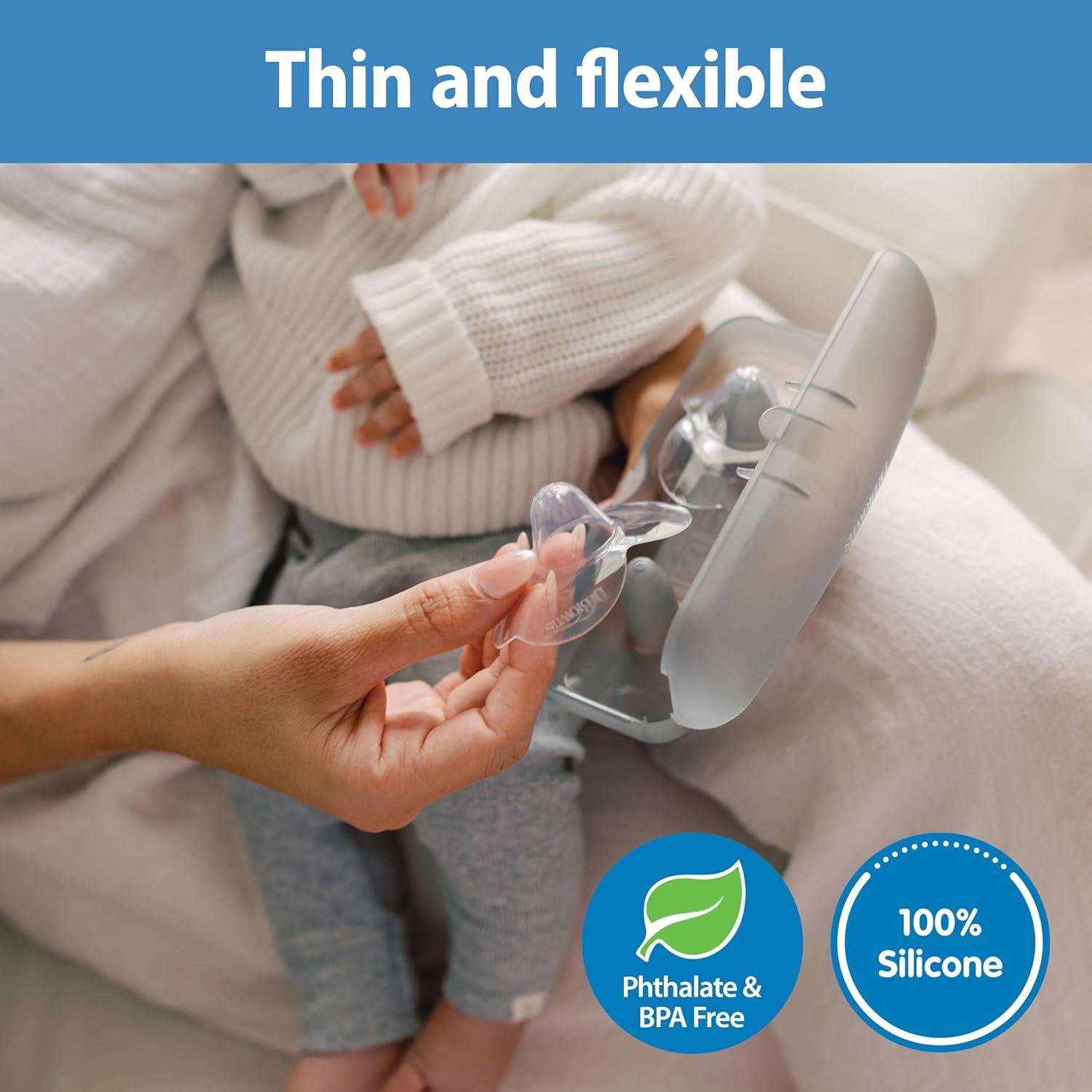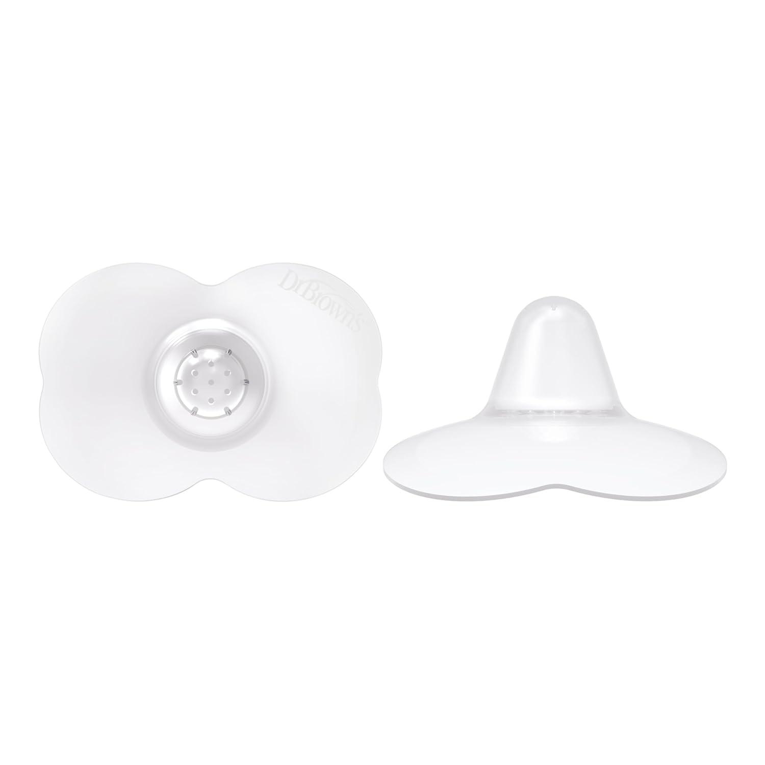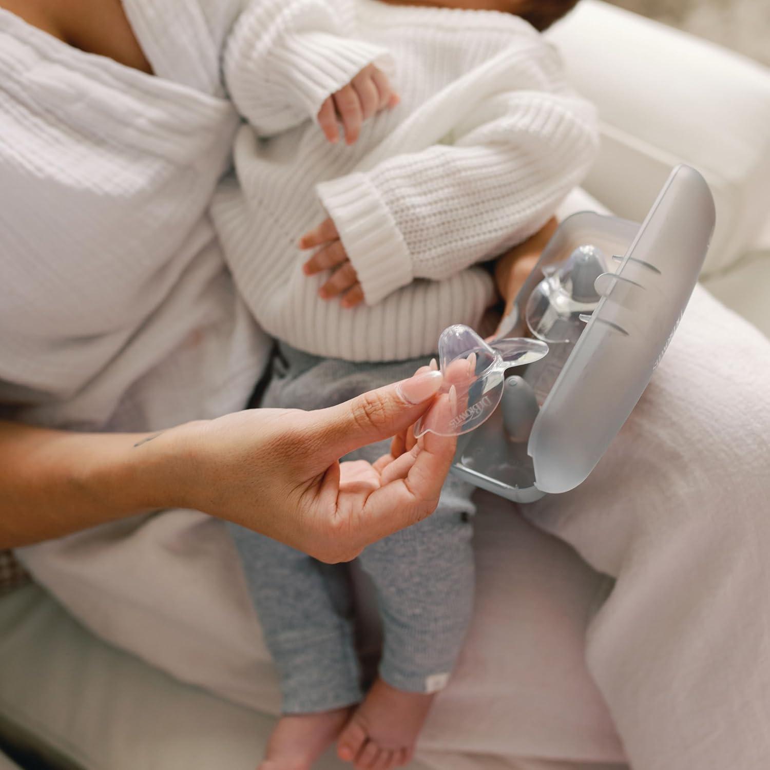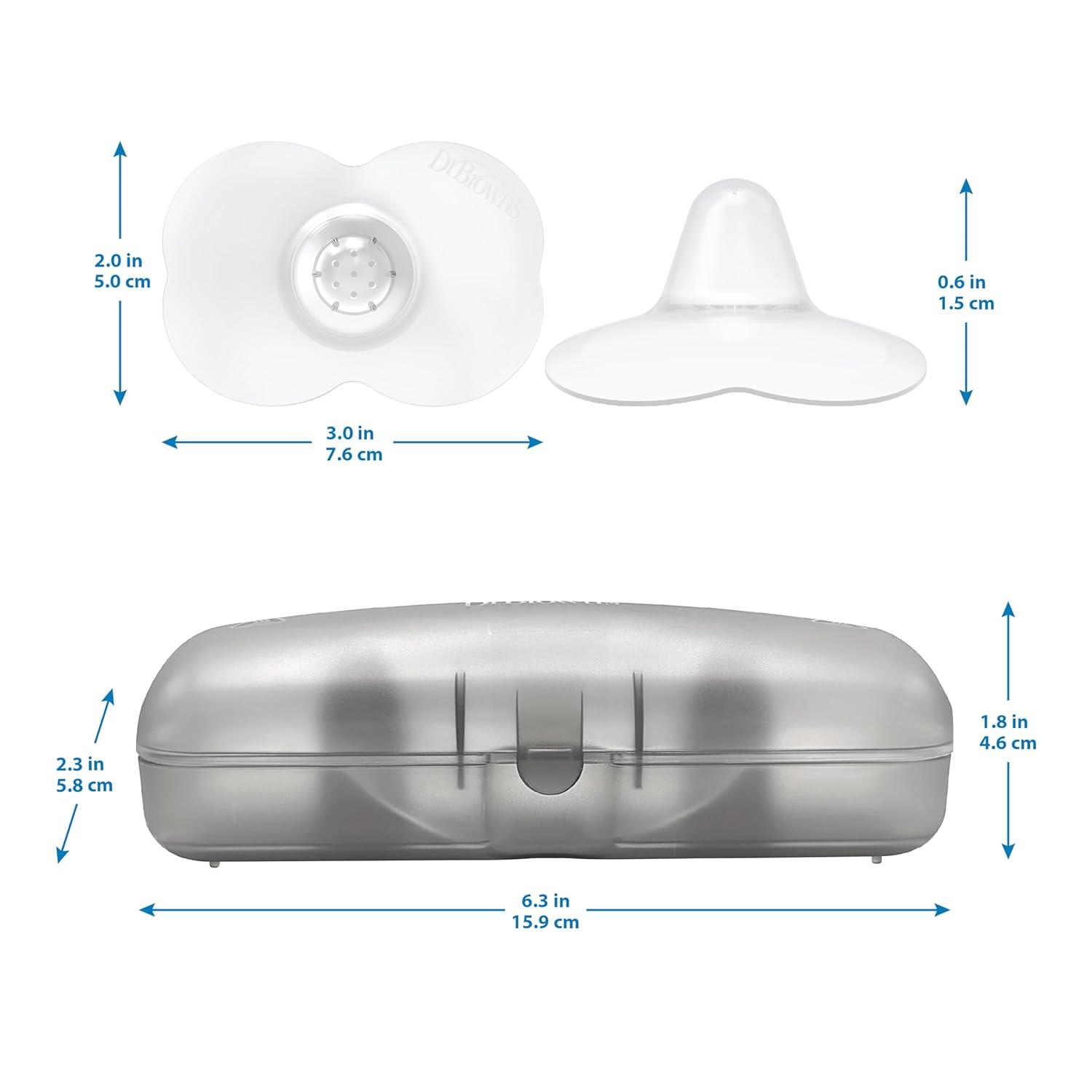 Dr. Brown’s Butterfly Nipple Shields are 100% silicone and contour to your natural shape for specialized breastfeeding. Made for nursing mothers/parents with breastfeeding challenges such as flat or inverted nipples, overactive letdown, and babies with latching issues. The nipple shields also help protect sore, raw nipples by creating a barrier between baby’s mouth and mother’s skin. The unique butterfly shape more naturally conforms to all shapes and sizes of breasts and allows for skin-to-skin contact between mom and baby during breastfeeding. The thin, flexible silicone warms to skin temperature and more holes make for a more natural feeding experience. Includes a carrying case that doubles as a microwave sterilizer. The shields sit side by side in the case to avoid stacking them and are elevated for better hygiene and air-drying. Sterilizing eliminates 99.9% of bacteria, mold, and the yeast that causes thrush. Phthalate and BPA-free. Nipple shields are temporary tools to use under supervision of healthcare providers. Comes with two (2) Nipple Shields and one (1) Storage Case.