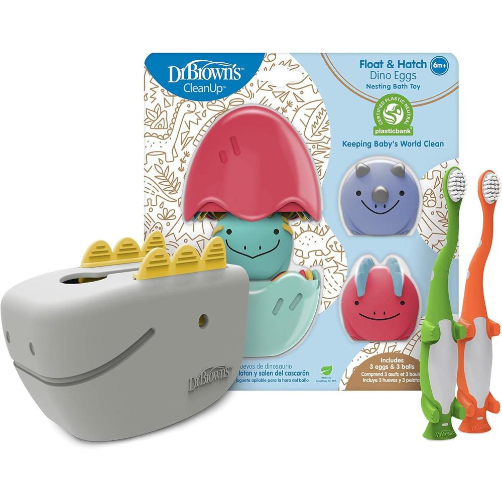Dr. Brown's Float & Hatch Dino Eggs baby bath toy provides egg-cellent bath time fun! The eggs “crack” open to reveal 3 nesting dino friends. Your little one will have fun improving hand-eye coordination and motor skills while scooping, straining, and reconnecting the vibrantly colored eggshells. These nesting toys can also be used as pool or water table toys for fun in and out of the tub and are made of materials safe for your little one – BPA and phthalate free. Dr. Brown's Baby Bath Essential items are Plastic Net-Zero in collaboration with Plastic Bank. We've removed the equivalent amount of plastic from the environment that's used in this product, leaving the oceans better than we found them.
