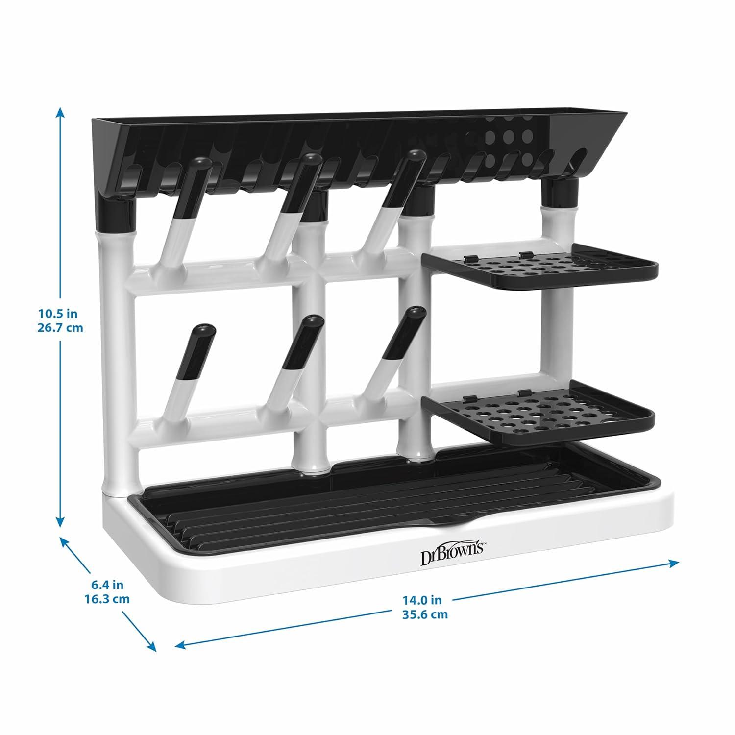Drying and storing baby's bottles and sippy cups now takes less room with Dr. Brown's Drying Tower. This compact countertop space saver lets you keep baby's accessories organized while leaving the drying towel behind. Drain, dry, and store baby essentials in one place so they're ready for use next time you need them. This stand-up baby bottle drying rack features six sturdy pegs designed to fit most bottles and sippy cups. Includes three trays for storing smaller accessories, and the removable bottom tray allows for quick cleanup of any drying drippage. Keep baby's smaller feeding parts and other accessories in one place with the additional top compartment for organizing and storing. The top compartment even features two hooks for hanging small cleaning brushes. BPA-Free.