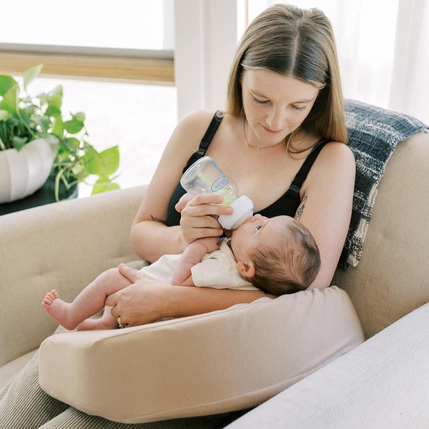 Made with carefully selected premium memory foam, Dr. Brown's Feeding and Nursing Lap Support Pillow is designed to make feeding more comfortable for mom and baby. The responsive firm memory foam cradles the natural curves of mom and baby while keeping little one supported and helps mom find a comfortable upright position for a perfect latch. The curved shape fits around all different body types, and the simple design is reversible and doesn't include any awkward straps or extra parts. The luxe brushed fabric pillow cover is soft and gentle on sensitive skin and is washer and dryer safe for easy cleaning. The cover is designed without a zipper for comfort and to slide easily on and off the pillow. Additional pillow covers are sold separately in three stylish colors: gentle beige, light grey, and storm green. The memory foam pillow is encased in water-repellent fabric to protect from spills and spit-up, simply wipe for easy cleaning. Recommended for use when feeding babies 0-18 months. WARNING: Read all instructions before using this product. Keep instructions for future use. Do not use if product is damaged. Never use feeding pillow without pillow cover. Always sit with pillow in lap to support baby safely. Do not allow baby to be supported only by pillow. Adult supervision is always required. Do not use for sleep. Do not use in sleep products like cribs, bassinets, or play yards. BABIES HAVE DIED USING NURSING PILLOWS FOR SLEEP OR LOUNGING. Babies can move without warning and CAN SUFFOCATE within minutes if their airway is blocked. Only use this product to feed baby. Move baby to an infant sleep product, like a crib or bassinet, if baby falls asleep or if you feel drowsy. Do not use pillow for sleeping. Never leave or prop up baby alone on this product. Never place this product where baby sleeps. Keep away from source of heat or open flame. Babies have been injured from FALLS. Do not use to prop up baby on beds, sofas, or other raised surfaces. Do not use to carry baby.