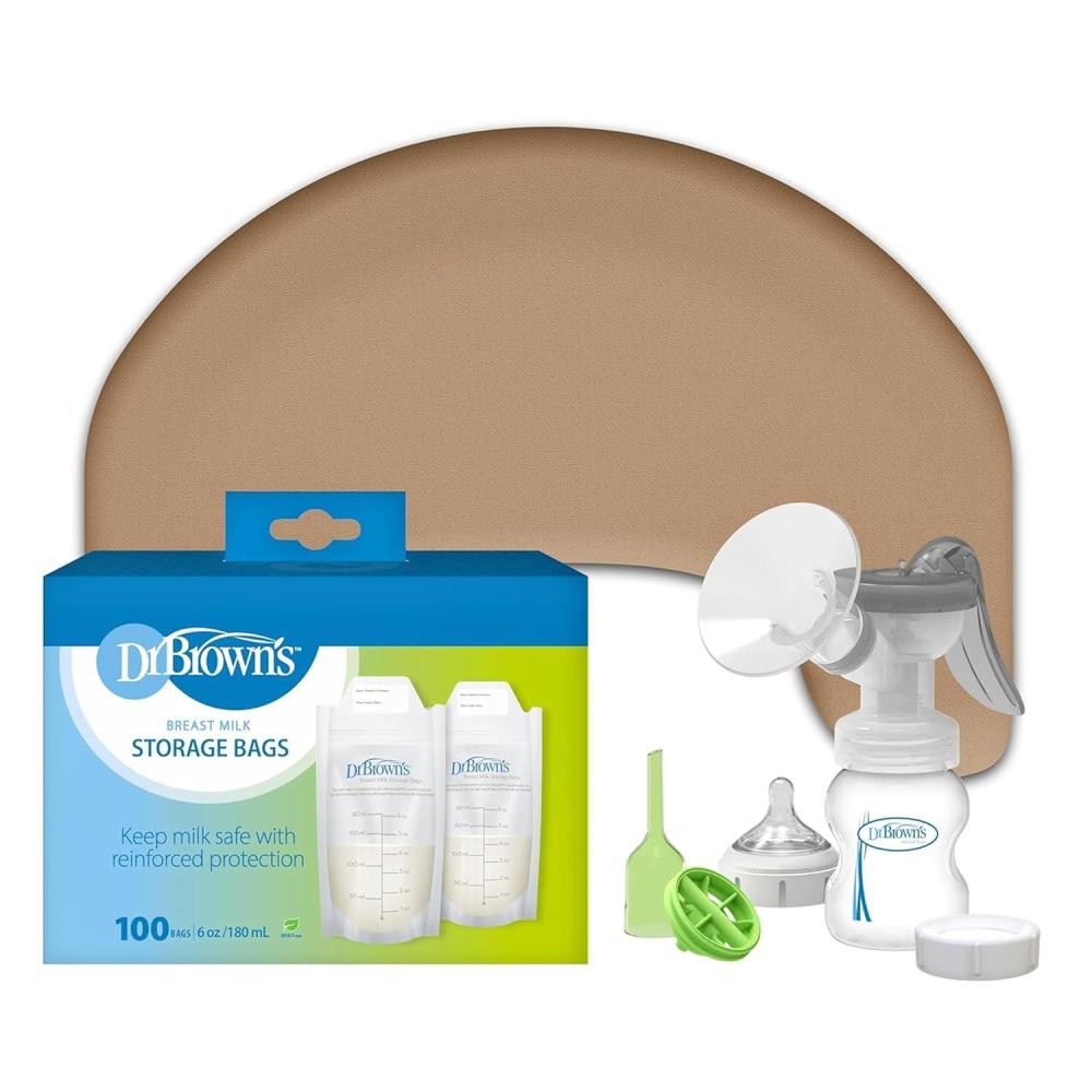 Dr. Brown’s Feeding Support Pillow with Cover, Gentle Biege & Manual Breast Pump & Breast Milk Storage Bags, (100 ct) 6 oz Bags, BPA free