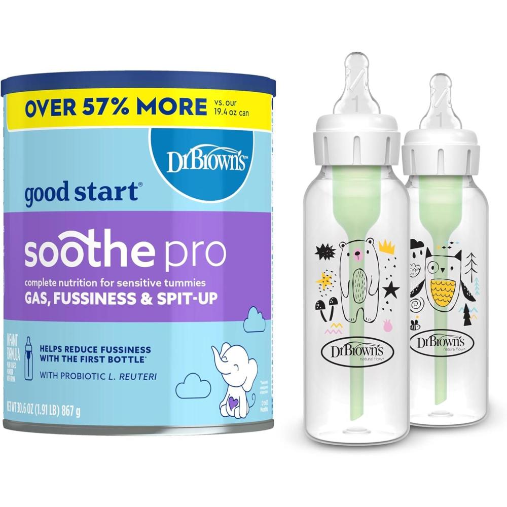 COMPLETE NUTRITION UNIQUELY FORMULATED FOR SENSITIVE TUMMIES: Good Start | Dr. Brown's Soothe Pro Infant Formula was created to address common feeding issues, including gas, fussiness, and spit-up. Clinically tested and shown to reduce fussiness with the first bottle, as reported in study results among parents of fussy infants.