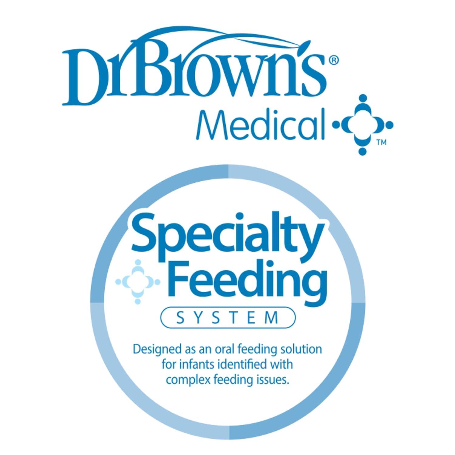 Dr. Brown's Medical Specialty Feeding System Bottle (SFS) was designed in collaboration with medical professionals seeking an oral feeding solution for infants identified with complex feeding challenges such as cleft lip and palate, ankyloglossia, high-arched palate, oro-neuromotor dysfunction, common or rare syndromic sequences, and/or craniofacial anomalies. The Specialty Feeding System exhibits the essential qualities of a Dr. Brown's Natural Flow bottle which includes the internal vent system, clinically proven to reduce colic – spit-up, burping, and gas. This bottle system also helps preserve vitamins C, A, and E in breast milk. The included Infant-Paced Feeding Valve is inserted into a Wide-Neck Dr. Brown's silicone nipple to create a “compression” nipple. When used in combination with a Dr. Brown's bottle system, the blue one-way valve assists the infant in self-regulation during oral feedings. The infant feeding system offers a consistent and reliable nipple flow rate for infant-directed feedings, and the non-squeeze method helps decrease gassiness, air intake, and burping. Dishwasher (top rack only) and sterilizer safe for convenient cleaning. Dr. Brown's Specialty Feeding Wide-Neck Bottle Set Includes: 3 – 5 oz/150 mL Baby Bottles, 6 – Infant-Paced Feeding Valves, 3 – Level 1 Nipples. Important: Consult your health care provider before using the Dr. Brown's Specialty Feeding System to confirm this bottle system is recommended for your baby's feeding challenge.