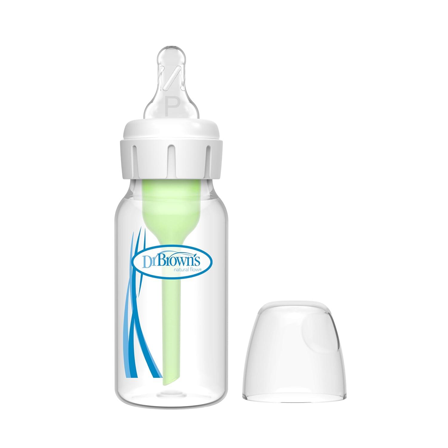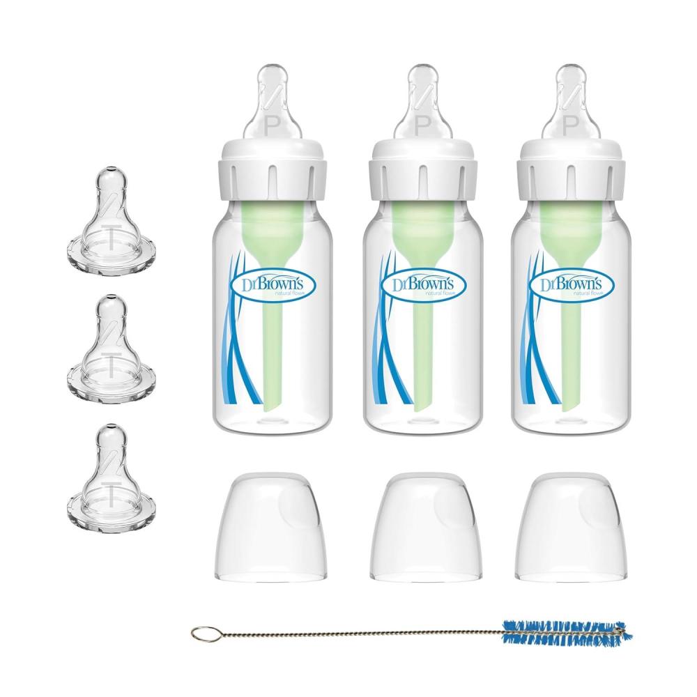 Dr. Brown's Preemie Flow Bottle Set is made with premature babies or newborns that need a slower flow nipple in mind. The Preemie Flow Nipple allows premature babies and infants that need a slower flow to feed comfortably. Great for breastfed babies too! When baby's feeding has progressed, switch to the Level T nipple. Level T Nipples are designed for babies requiring a slower flow nipple than Dr. Brown's Level 1 Nipple or needing to transition up slowly from Dr. Brown's Preemie Flow Nipple. The nipple, together with Dr. Brown's Anti-colic internal vent system, is clinically proven to reduce colic. Dr. Brown's bottle and nipple provide a more comfortable feeding experience for baby by decreasing spit-up, burping and gas. This vacuum-free feeding is closest to breastfeeding and Dr. Brown's Nipples provide a consistent flow so baby can feed at their own pace. The breast-like nipple shape encourages a proper latch for a more natural bottle-feeding experience and eases the transition from breast to bottle and back again. The Preemie Flow and Level T Nipple and Anti-Colic vent system is proven to help preserve bottle milk nutrients and aid in digestion for a better night's sleep. Made of super-soft, 100% silicone, the Preemie Flow and Level T Nipples fit all Dr. Brown's Narrow bottles. Always use the vent system with Preemie Flow and Level T Nipples. Safe for use in dishwasher (top rack only), electric and microwave sterilizers or boiling water. 0m+. BPA free. *IQVIA Health ProVoice Survey 2024.