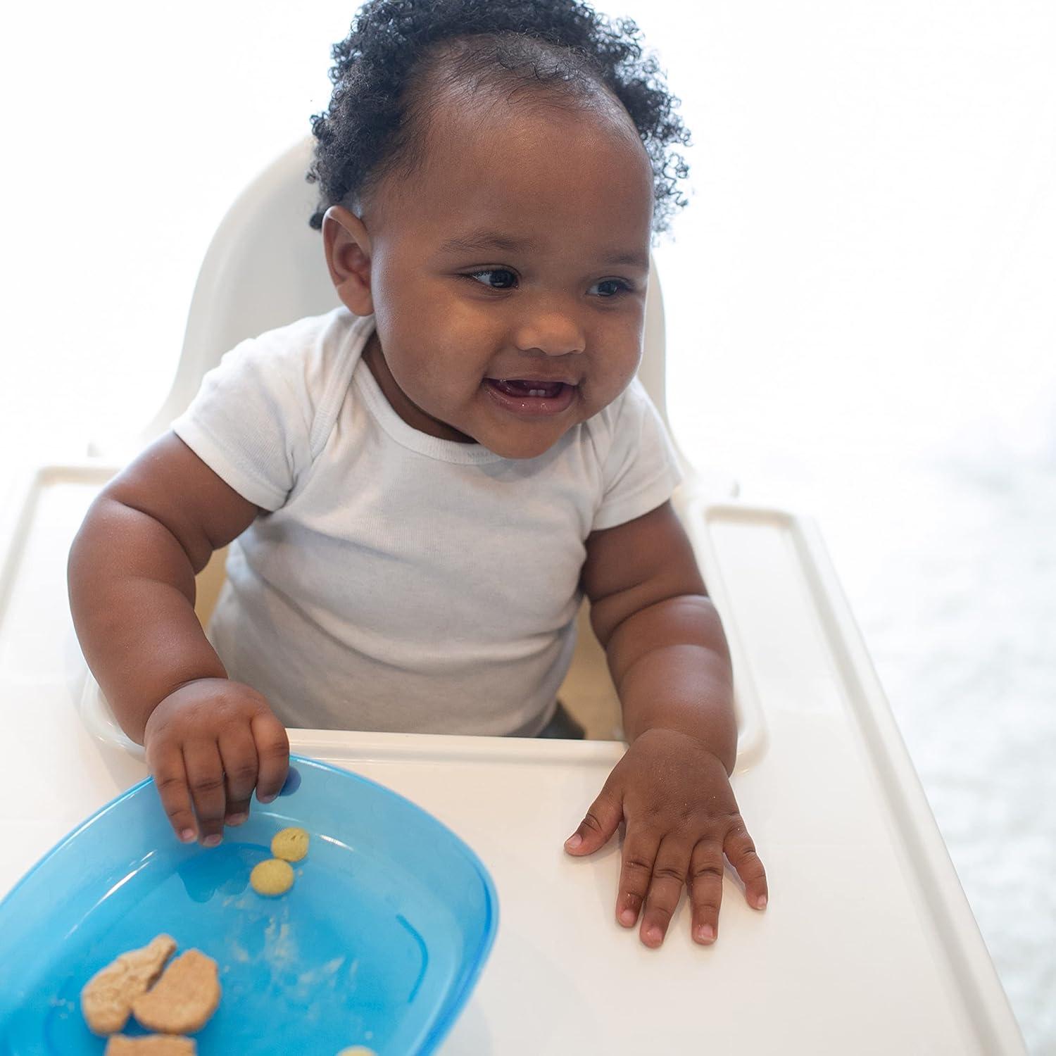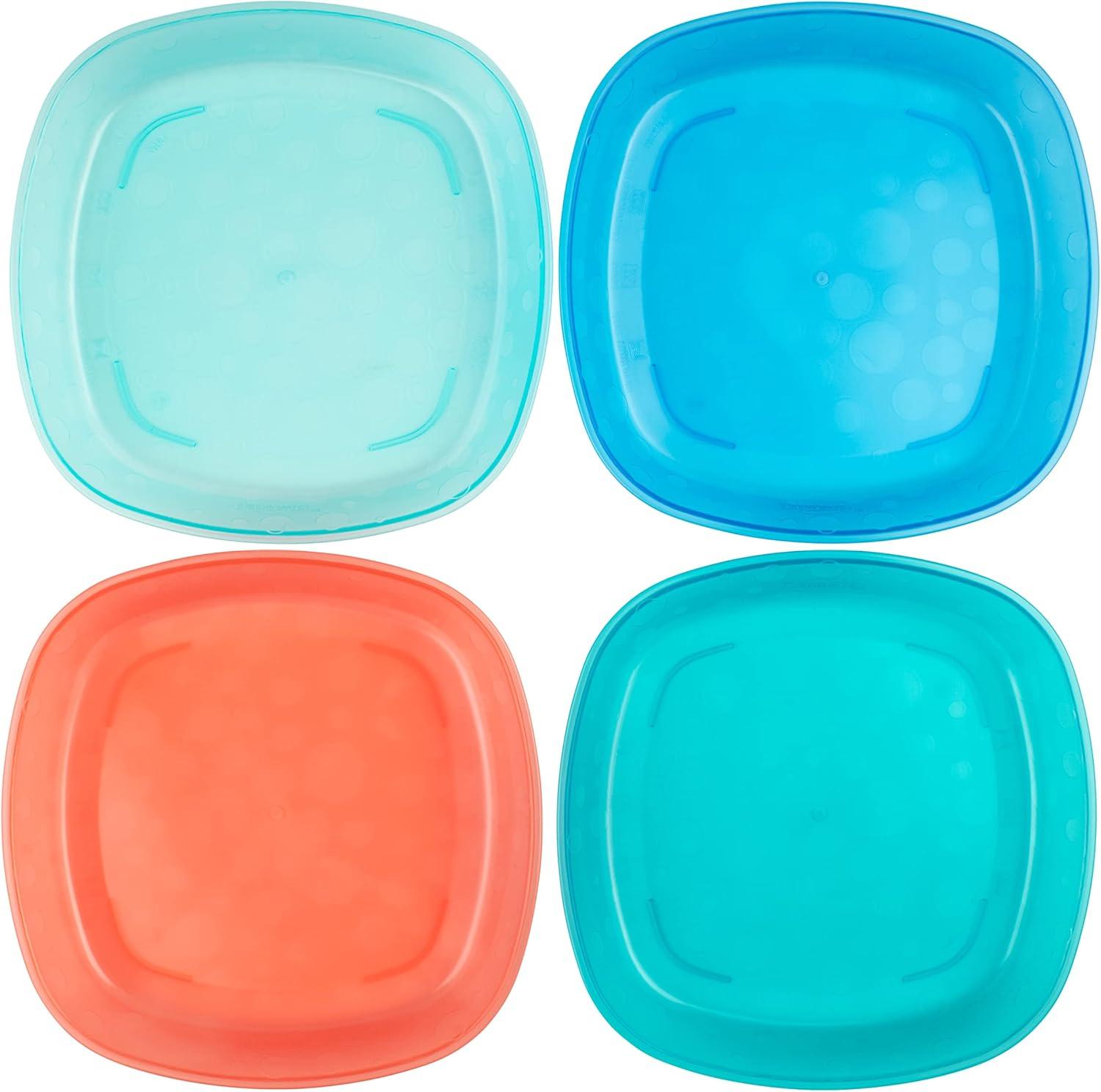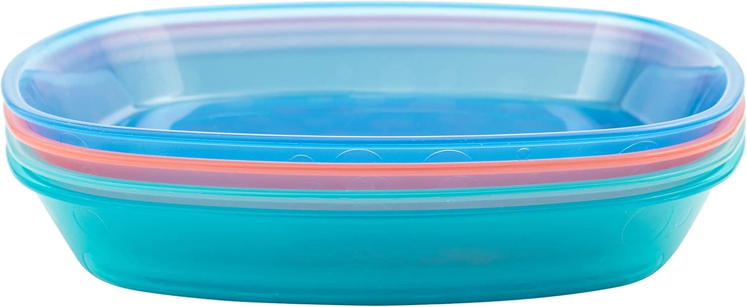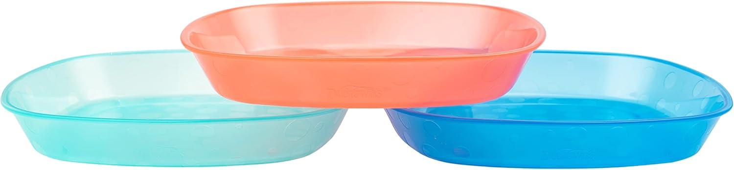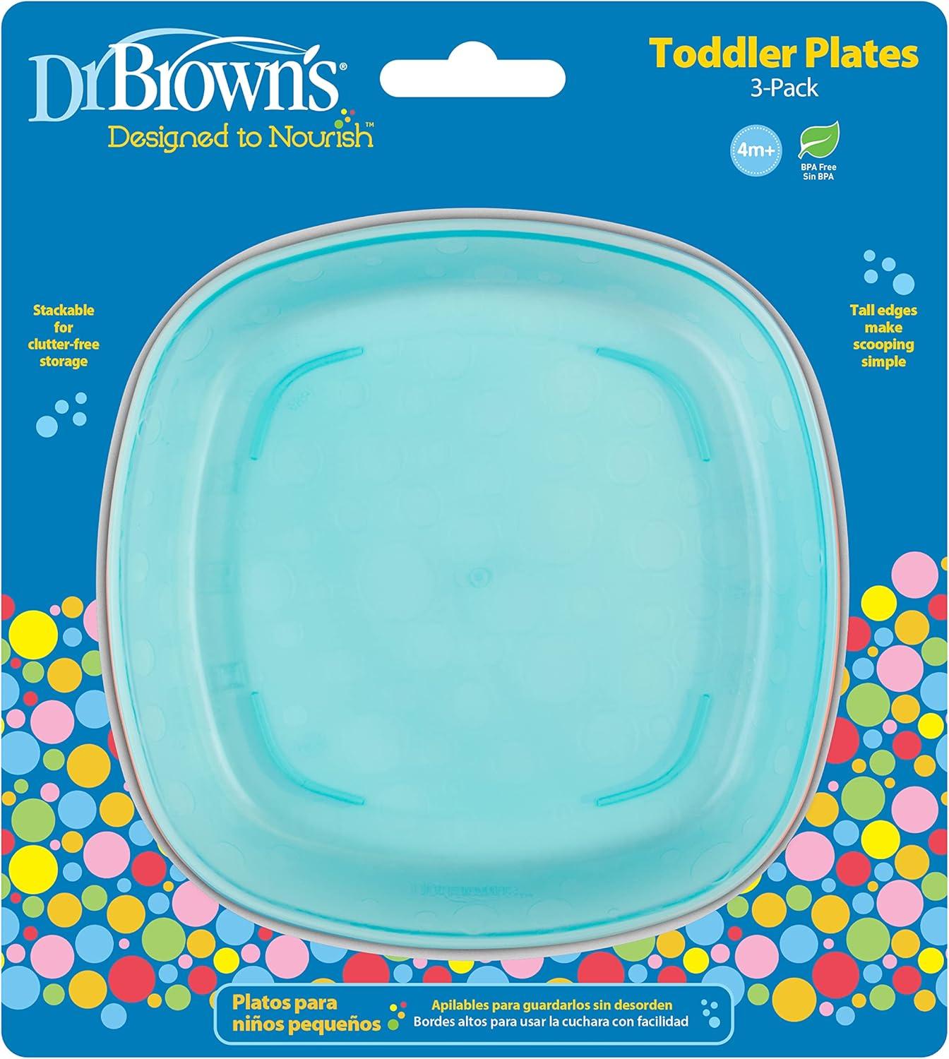 Solid feeding is happy feeding with Dr. Brown's Toddler plate! Transitions to first foods are easier and more fun with the bright, colorful toddler plates 4-Piece dish set. Tall edges on the plate make scooping and grabbing food simpler for little hands and make less mess at mealtime. The stackable style makes for organized storage, while the microwave- and freezer-safe material makes food prep a cinch. These toddler plates can be cleaned in a snap and are dishwasher (top rack) and sterilizer safe. Bpa free. 4M+.