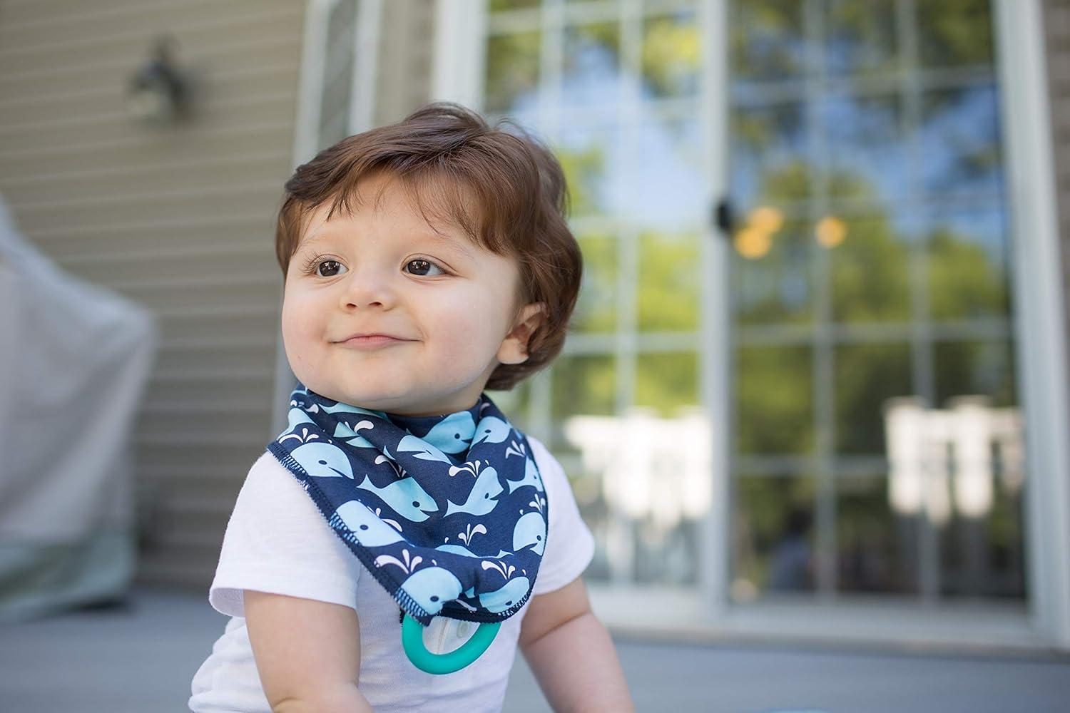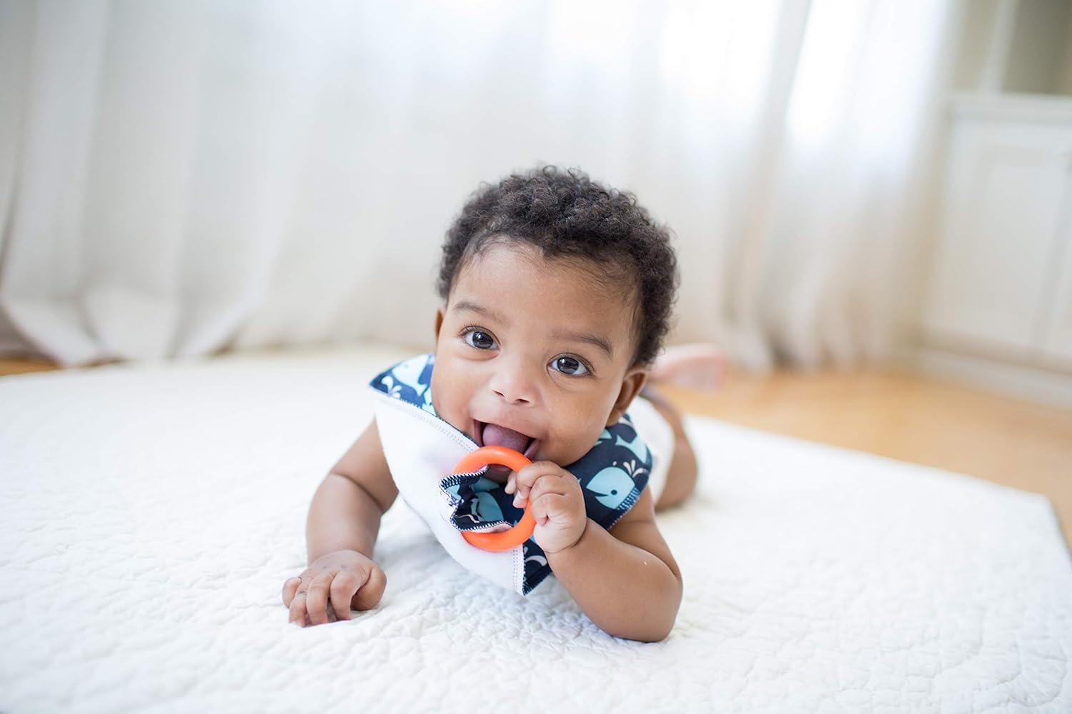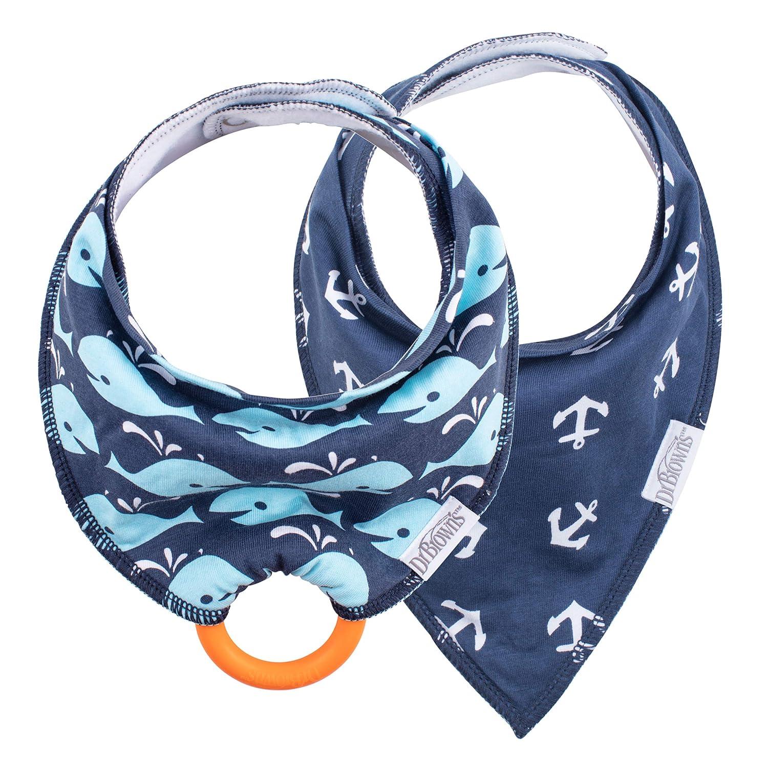 Keep your teething baby dry in style with Dr. Brown’s Bandana Bib with Removable Teether! The baby bandana bib is super-absorbent to catch drools and dribbles from your teething little one. The bib features a 100% cotton front and a soft fleece lining to keep baby comfortable. Featuring two snap closures to provide an adjustable fit around baby’s neck, plus additional snap closure to secure the included 100% silicone teether, keeping it within baby’s reach so they can easily self-soothe and help relieve sore gums. The teether can also be swapped out for other similarly sized teethers they love and most pacifiers with a handle. The bib can also be worn with no teether or pacifier attached. For easy cleaning, the Banana Bib is machine washable and the teether is dishwasher (top rack) and sterilizer safe. Available in 2-packs in a variety of cute patterns.